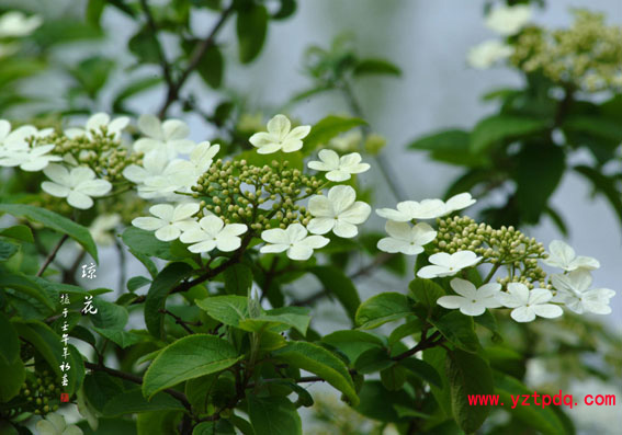 瓊花屬忍冬科莢屬,是一種落葉或半常綠灌木,高可達數米。瓊花的枝條多呈灰黑色,幼枝、芽、葉柄均有灰白色或黃白色的垢屑狀星狀毛。葉對生,卵形、橢圓形、或卵狀長圓形,長5厘米~11厘米不等,邊緣有細齒,表面疏生星狀柔毛,背面密生星狀柔毛。每年4月中下旬開花,5月上中旬終花?;榇笮途蹅慊ㄐ颍纱笮筒辉谢ê蛢尚孕』▋刹糠謽嫵?。大型不孕花多為8朵,分布于花序周圍,也偶有7朵、9朵、10朵甚或更多者,每朵花冠直徑約3.2厘米~4.5厘米,最大可達7厘米,每朵5瓣,初開芽綠色,漸轉黃白色,盛開全白色;另一部分為花序中間簇生的數10朵乃至近百朵兩性小花朵,花冠輪狀,白色,直徑僅7毫米~10毫米,亦分5瓣,有雄蕊5枚,黃色,雌蕊一枚,子房下位。兩性小花有奇香。大型不孕花比兩性小花早開7天左右,凋落亦比兩性小花早。如遇秋季氣溫回升或暖冬天氣,可二度開花。瓊花果實由兩性小花受粉后形成,初時青綠,繼而米黃,再轉暗紅,最后紫黑,百果成簇,每粒長約10毫米~12毫米,寬約7毫米~8.8毫米,呈扁平、橢圓形。