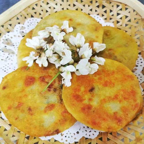 昨天 恰巧看到有人拿竹竿打下了好多槐花,我統統買了回來,足有8斤多!回來后請廚師用清水洗凈,用鹽水浸泡,揉面焯水,裹調拍打成形,兩面煎烤,一塊塊槐花餅受熱膨脹,香氣四溢!不由得垂涎滴襟腸肚慌,眾人爭相把餅嘗。咬一口松軟彈牙,嚼著嚼著清香可口,唇齒間留住了春天的味道,妙不可言!淡淡的槐花和雞蛋的香味,讓你的味蕾綻放開來,那種焦、香、酥、脆的感覺會讓你久久不能忘懷!嚼著嚼著,眼前浮現童年時的光景,小河脈脈,蛙聲四起。也許這種悠長的懷念,就是鄉愁!