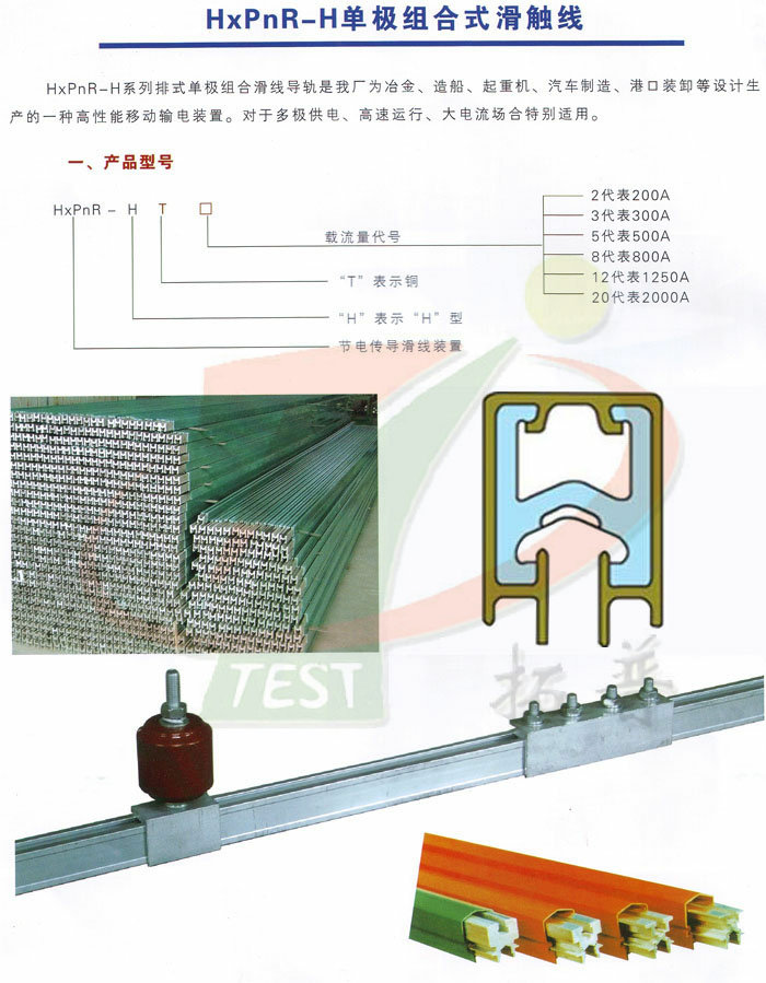 HXPnR- H系列單極組合式滑觸線由H型鋁合金本體導軌加壓V型不銹鋼滑接帶、PVC絕緣外殼、外置式集電器以及懸吊、固定等組件組合而成。該產品以其設計新穎、結構合理、維護方便、使用安全等特點被廣泛應用于電流較大、使用頻率較高、運行速度快和環境較差的場合。
